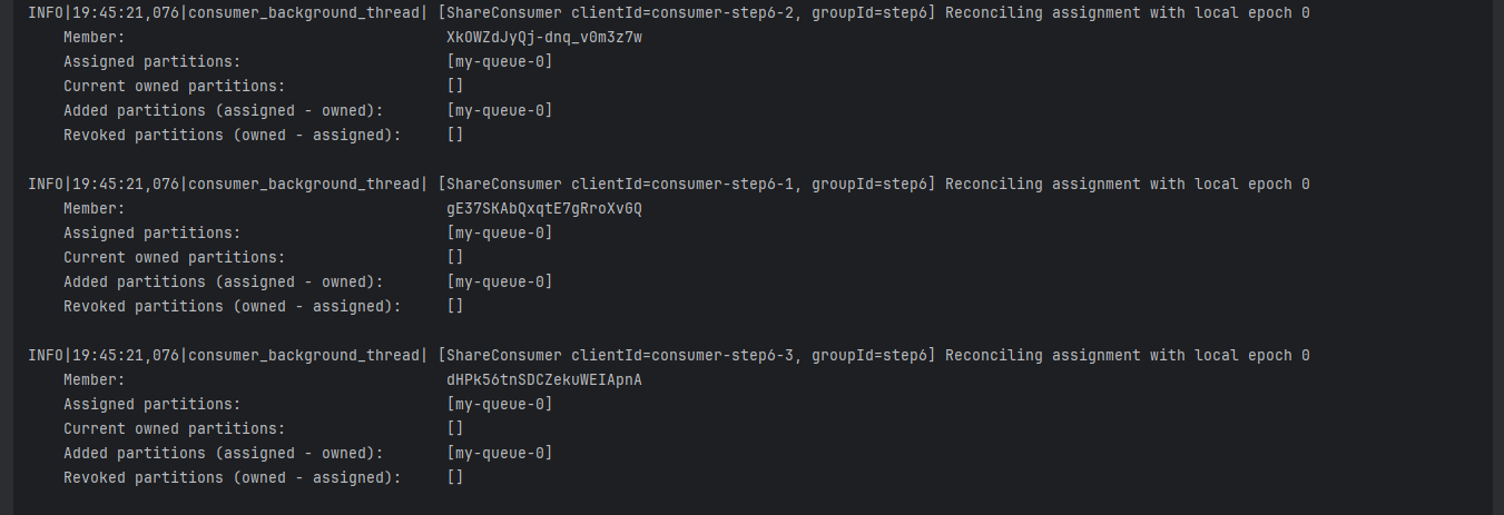 - Analyze logs, you can see that different members are assigned to the same topic partition