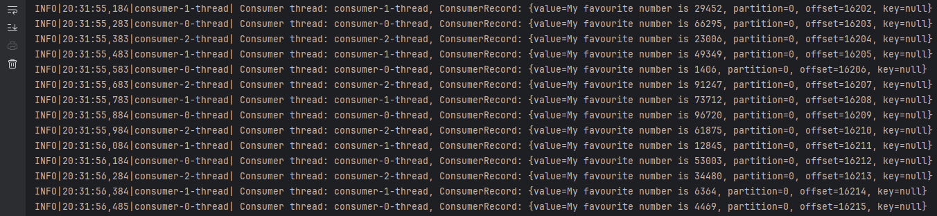 13. Finally produce some messages by running com.pszymczyk.step6.PublishRunner. In the application logs you will see that our application is consuming messages from single topic partition on multiple Kafka Consumer instances running on different threads (not possible before 4.1.0 release)