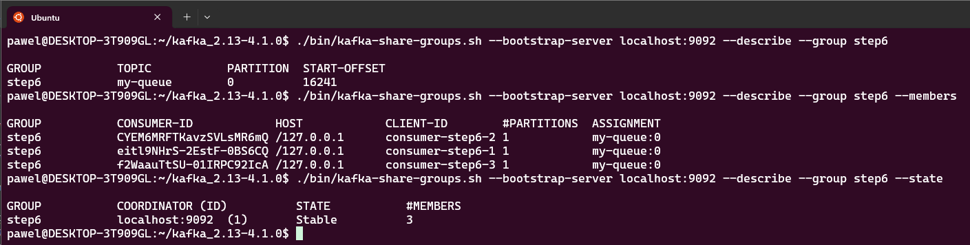 12. Check consumer group state and members using Kafka CLI, you should also see that we have 3 members assigned to the same topic and partition: